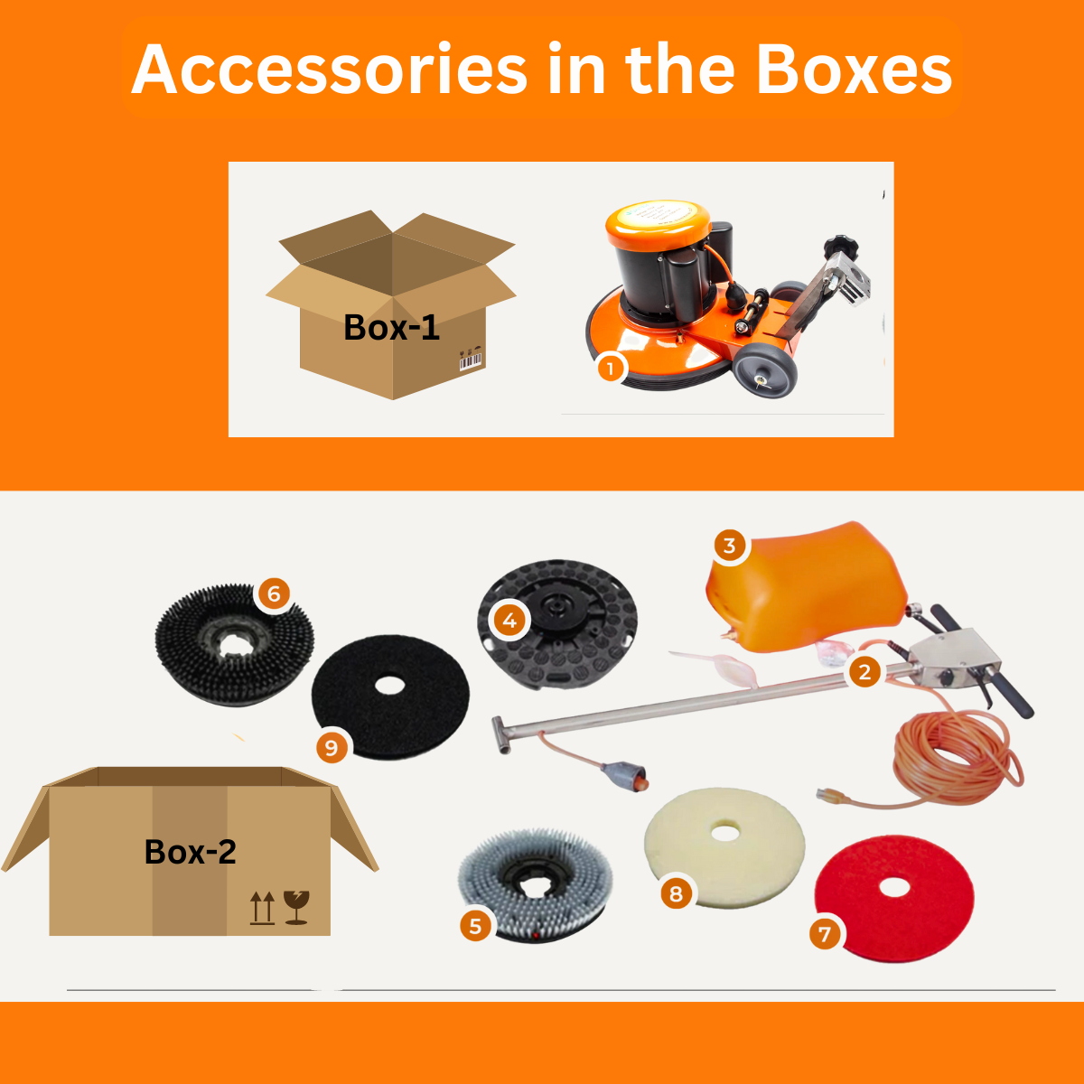 Each purchase includes the main unit, equipped with a brush motor assembly, lever assembly, water tank, pad driver, and a selection of brushes and scouring pads designed to address any cleaning requirement.