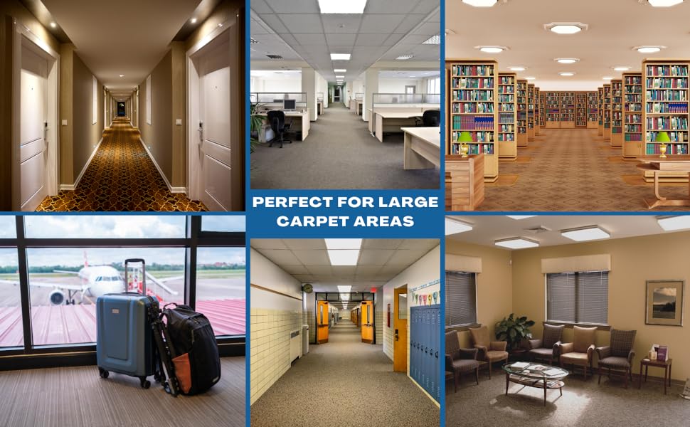 • Perfect for cleaning large carpet areas, such as hotels, offices, airports, and other commercial and industrial settings, and public spaces where large amounts of foot traffic can result in heavy soiling and stains on carpets.